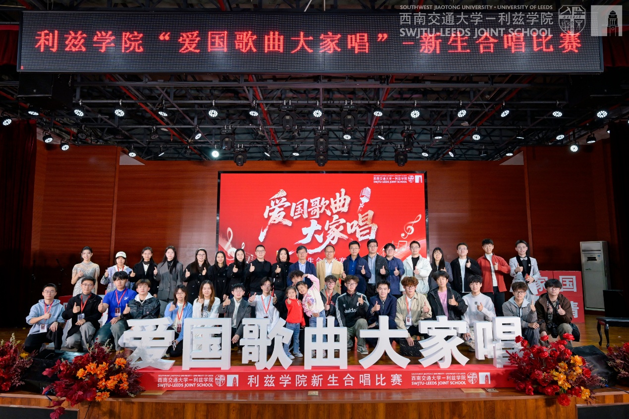 2025年10月26日晚,利兹学院“爱国歌曲大家唱——新生合唱比赛决赛”在犀浦校区一食堂学生活动中心温情开唱。学院党委书记江久文、党委副书记刘耀谦、副院长赵坪锐,西...