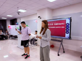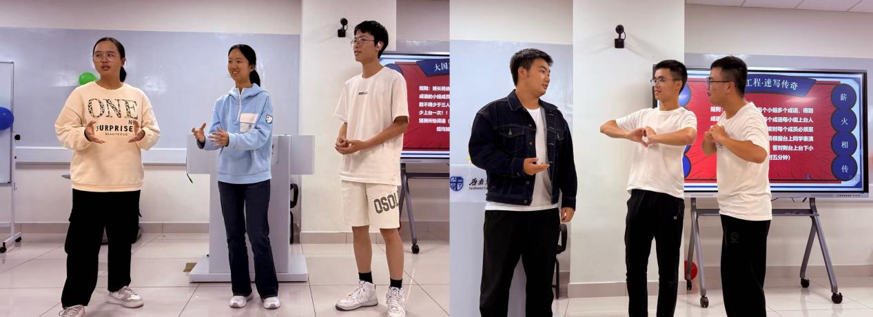 随后的“你画我猜”环节进一步增添了轻松氛围。围绕“新时代科技成果和校史”主题,同学们通过画画或动作表达“复兴号”“交大校训”等词语。有人为了表现“复兴号”的速度手忙脚乱,有人在画“校训”时认真描摹,大家在笑声中逐渐熟悉,也拉近了彼此的距离。