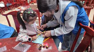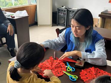 每周日上午,龙吟社区打造的非遗英语课堂如期开课。志愿者们将剪纸、脸谱等中华优秀传统文化与英语词汇学习深度融合,带领孩子们在亲手体验非遗技艺、感受中华文化魅力的同时,通过双语互动锻炼跨文化表达能力,进一步增强文化认同感与语言应用能力。
