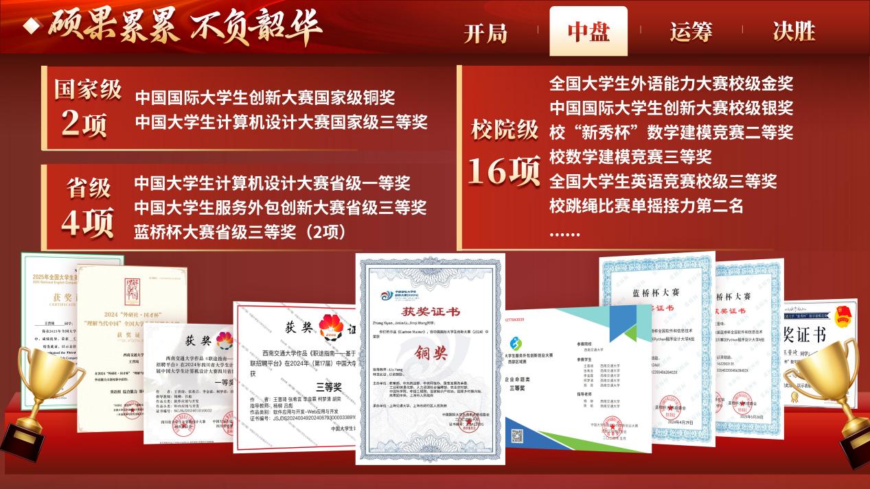 国际象棋棋盘上,她是深思熟虑的国家二级棋士;计算机专业领域里,她是逐光而行的优秀学子。利兹学院2022级计算机科学与技术专业本科生王晋琦,将棋道智慧融入三年大学时光,以“竢实扬华、自强不息”的交大精神为指引,在学业、科研、实践的广阔天地间落子无悔,最终斩获西南交通大学个人最高荣誉——“竢实扬华奖章”!这份荣耀既是对她过往努力的极致肯定,更是她奔赴新征程的闪亮起点。