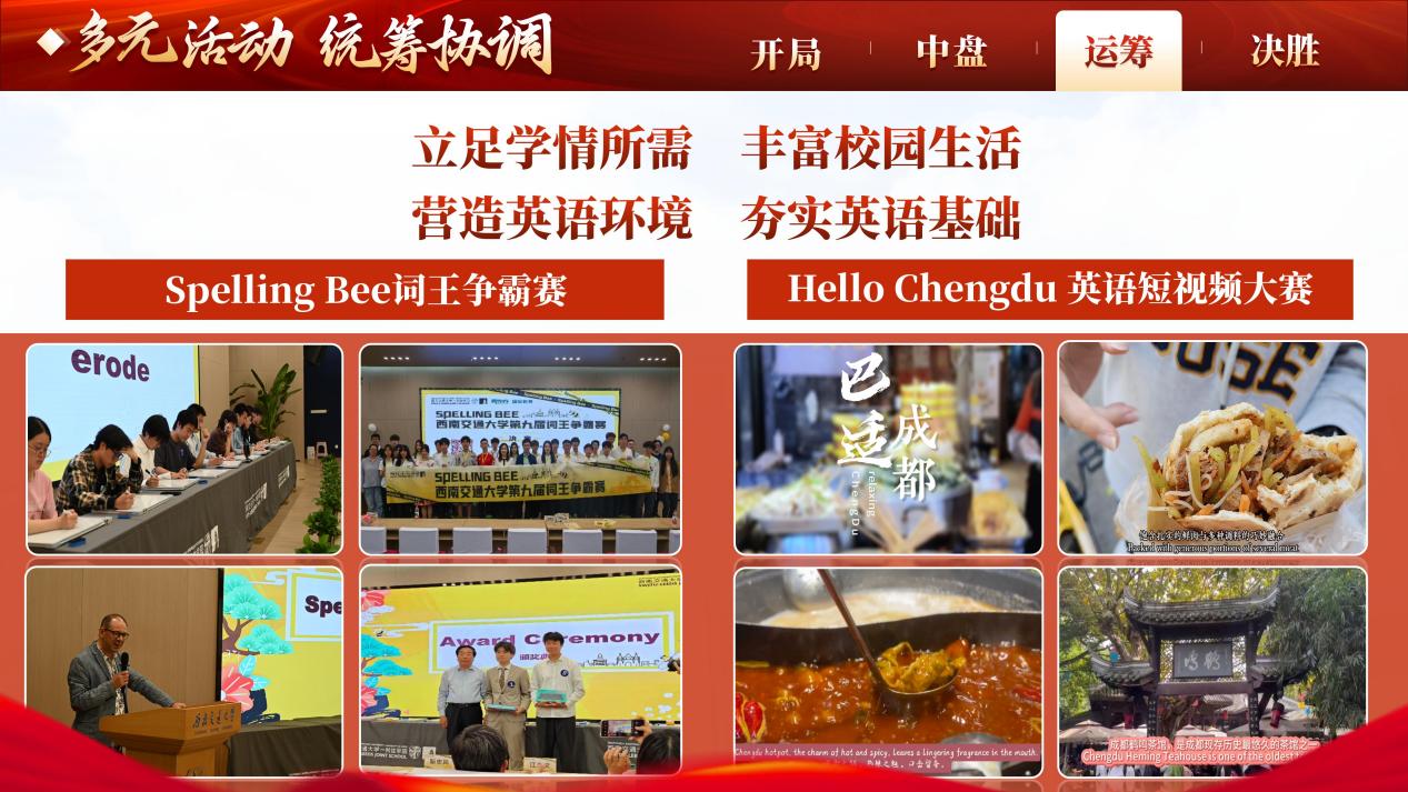 作为中共党员,她始终牢记初心使命,积极发挥先锋模范作用。担任校学生委员会委员、利兹学院学生会主席团成员期间,牵头或协办校院级活动40余场,实践时长超300小时,覆盖师生超1000人次。其中,Spelling Bee词王争霸赛Hello Chengdu英语短视频大赛成为校级精品第二课堂活动,为全校学子搭建起英语交流与展示的优质平台。