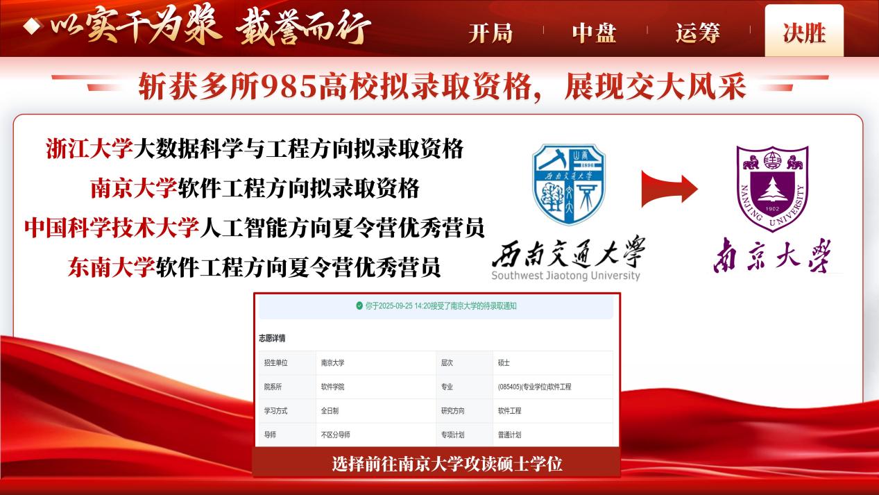 三年沉淀,厚积薄发。凭借过硬的综合实力,王晋琦一举斩获浙江大学、南京大学、中国科学技术大学、东南大学4所高校拟录取资格,最终选择前往南京大学软件工程专业攻读硕士学位,深耕大模型驱动的代码智能续写等前沿方向,立志助力我国智能软件工程迈向自主高效新阶段。