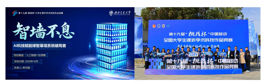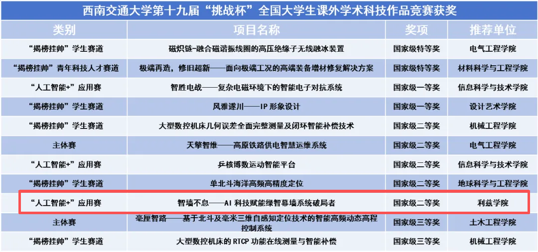 同时,ATIB加大“三大赛”精准培育力度,助力学子在高水平赛事中突破。在中国国际大学生创新大赛高教主赛道,学院学生牵头项目斩获国家级银奖1项、铜奖3项;在第十九届“挑战杯”竞赛中,推荐项目“智墙不息——AI科技赋能绿智幕墙系统破局者”,荣获“人工智能+”应用赛国家级二等奖1项,科创育人成效显著。