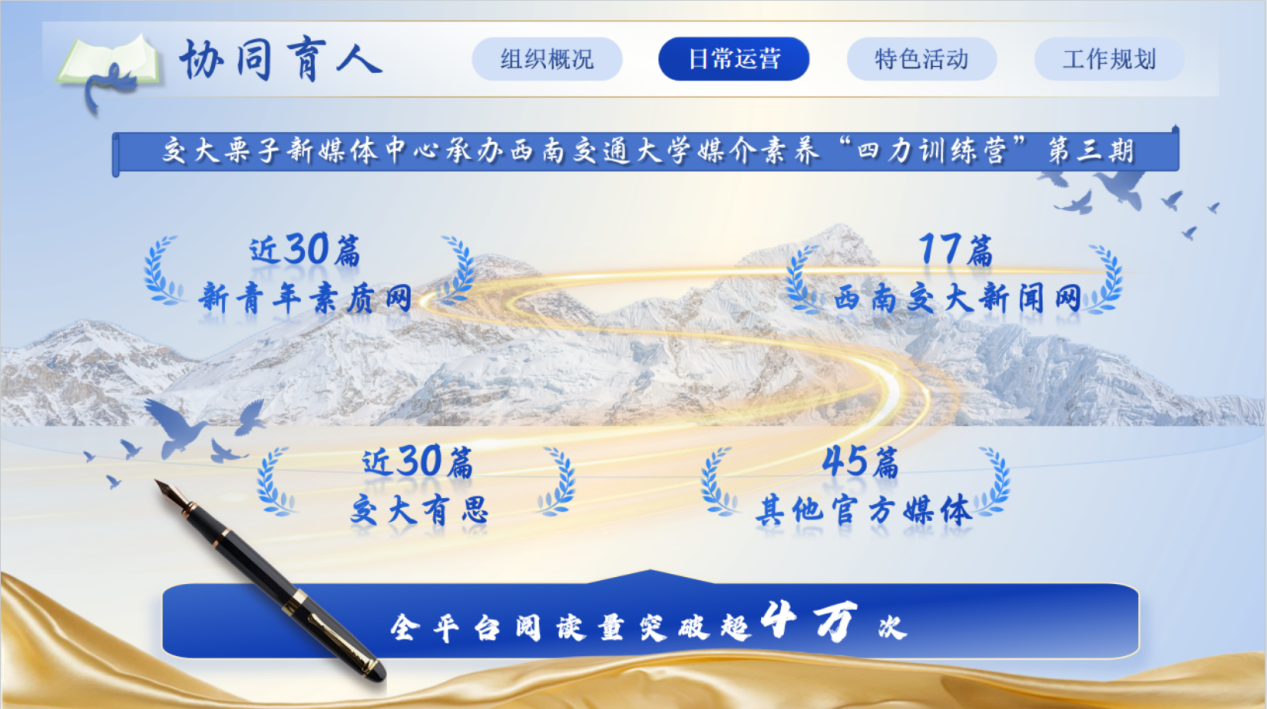 中心持续拓展传播渠道,累计在新青年素质网、西南交大新闻网、交大有思等校内外平台发布稿件近百篇,其中多篇内容被其他官方媒体转载,全平台阅读量突破4万次,体现了较强的传播影响力与内容覆盖面。承办第四期西南交通大学媒介素养“四力训练营”,以实践培训提升学子媒介应用能力,助力青年成长成才,深化服务育人内涵。