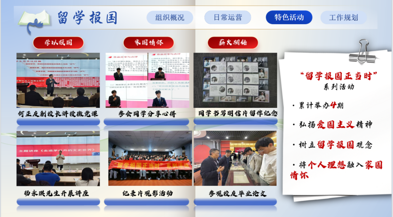 深耕爱国主义教育,持续开展4期“留学报国正当时”系列活动。活动通过微党课、读书会、纪录片观影、参观校友毕业论文等多种形式,构建理论教育、情感浸润与实践传承相结合的育人体系,引导广大学子弘扬爱国主义精神,牢固树立“留学报国”的理想信念,自觉将个人追求融入国家发展伟业。