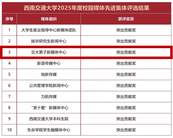 交大栗子新媒体中心始终以校园传播与价值引领为核心,构建“平台联动、内容创新、服务育人”深度融合的网络思政新生态。2025年,中心凝心聚力务实笃行,凭14个特色专栏、596篇原创内容、超10万人次浏览量的扎实成效,斩获西南交通大学2025年度校园媒体先进集体“突出贡献奖”,书写了育人传播的精彩篇章!