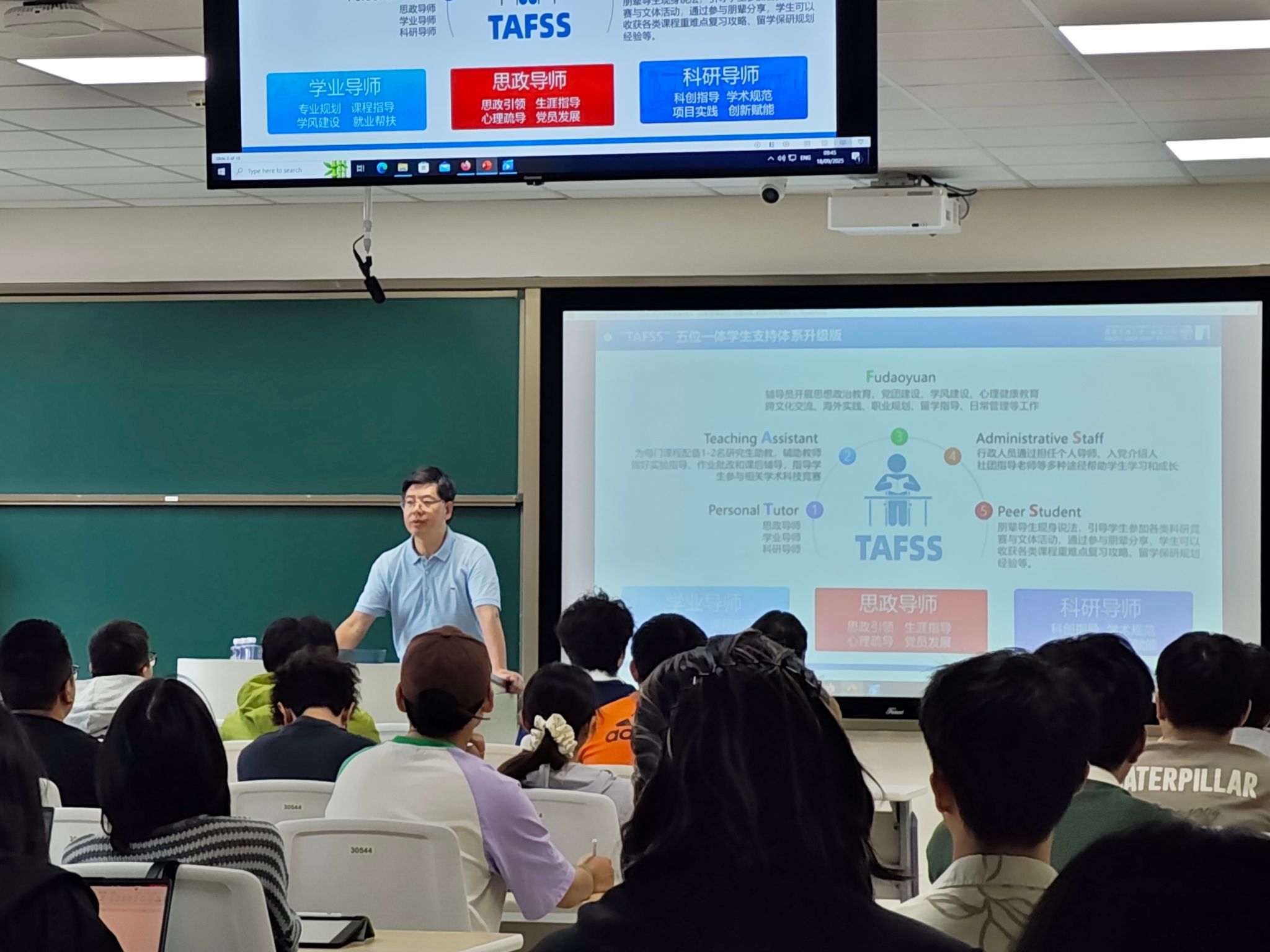 在师德师风专题中,学院党委书记江久文介绍了利兹学院“TAFSS五位一体”学业支持体系,高度肯定了助教群体在学院人才培养工作中的重要贡献。他勉励全体助教明确责任担当,为学院“三全育人”贡献力量,同时实现个人提升与成长。
