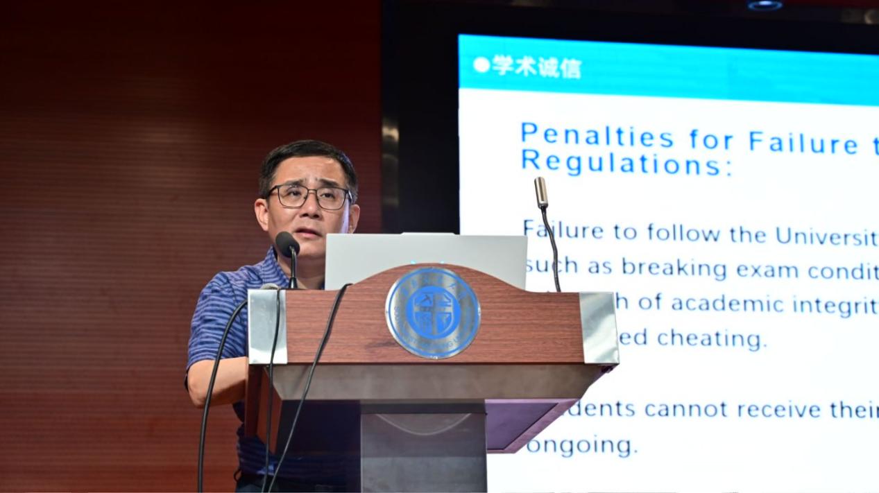学院学生支持中心主任邱君捷和教学教师事务中心主任陆宇佳为全体新生系统讲解Assessment Code,详解课程学分、升级标准、补考机制、作业缓交和缓考申请等内容,帮助新生提前适应全英文教学模式。