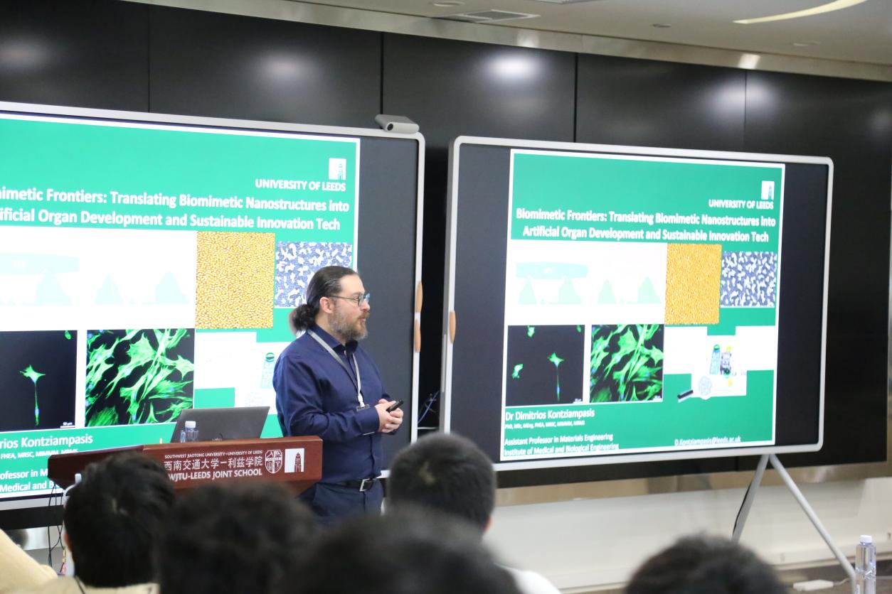 11月12日下午,利兹学院首次科研座谈会在西南交通大学犀浦校区3号教学楼X30519举行。本次活动邀请了利兹大学的材料工程助理教授Dimitrios Kontziampasis带来主题为“微纳工程:从基础研究到实际应用”的专题分享。利兹学院副院长黄涛,利兹学院机械专业负责人田怀文,15名机械、材料专业教师和学院“青年优才”教师代表,以及60名本、博学生代表参加本次活动。