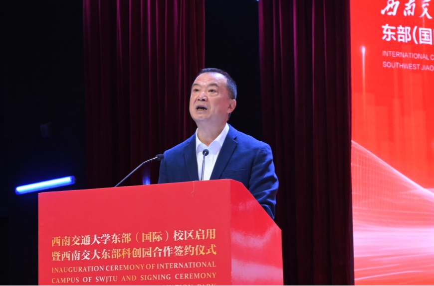 詹庆代表成都东部新区党工委管委会祝贺西南交通大学东部(国际)校区启用。他表示,西南交大扎根新区,注入了宝贵的人才资源与创新动能,标志着校地合作进入深度融合、协同共兴的新阶段。新区将全力做好服务保障,营造优良环境,让师生安心立业,围绕东部科创园,加快构建高校与企业常态化对接平台,支持联合研发与技术攻关,推动学校科研成果在新区落地转化。同时,将持续促进西南交大与区内其他高校的联动,在学科建设、人才培养等方面资源共享、优势互补,共同提升区域高等教育整体实力。相信在各方共同努力下,西南交大东部(国际)校区必将成为人才摇篮、创新高地和校地合作典范。