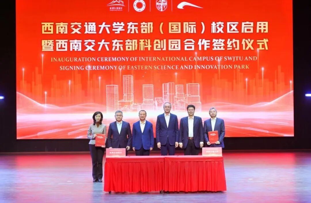 成都东部新区党工委委员、管委会副主任杨敏,副校长王平分别代表成都东部新区和西南交通大学签订西南交大东部科创园合作协议。詹庆、杨俊、余敏明、闫学东见证签约。