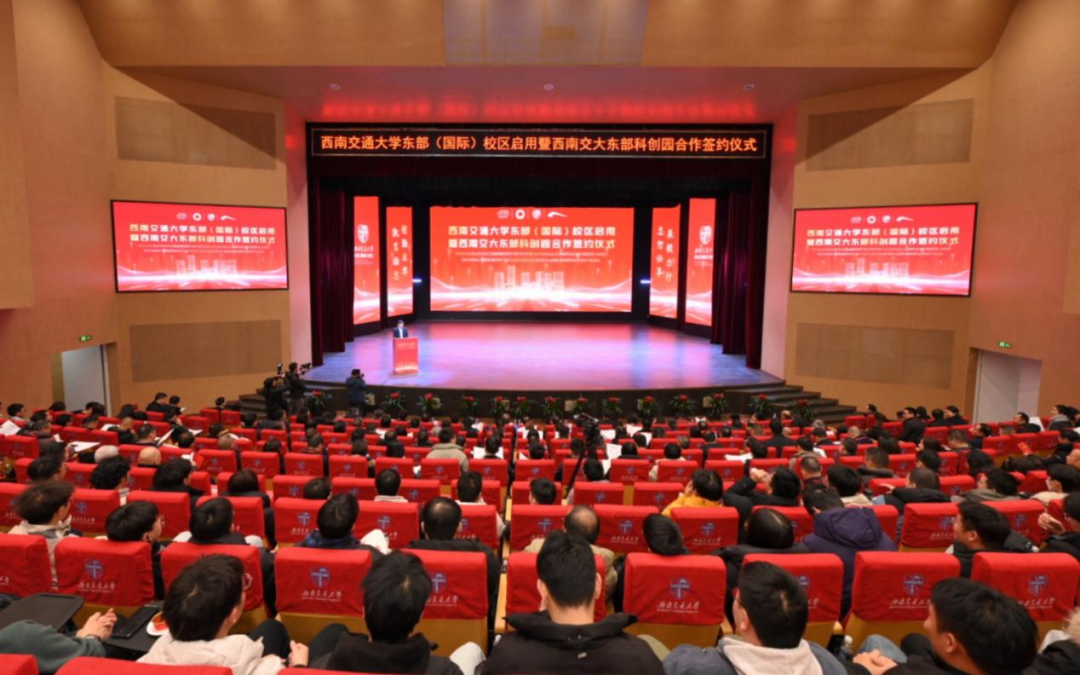 1月21日,西南交通大学东部(国际)校区启用暨西南交大东部科创园合作签约仪式在东部(国际)校区学生会堂举行。四川省政协副主席、九三学社四川省委会主委杨丹,成都市政协副主席、成都东部新区党工委书记詹庆,成都东部新区党工委副书记、管委会主任杨俊,成都轨道交通集团有限公司副总经理郭志宏,西南交通大学党委书记余敏明,校长闫学东,党委副书记杨爱华,党委副书记、纪委书记夏玉峰,党委副书记高平平,党委常委、副校长康国政、刘长军、王平,党委常委、统战部部长汪铮,党委常委、组织部部长朱剑松,校长助理宋新、崔凯出席活动。学校党委常委、副校长何正友主持仪式。