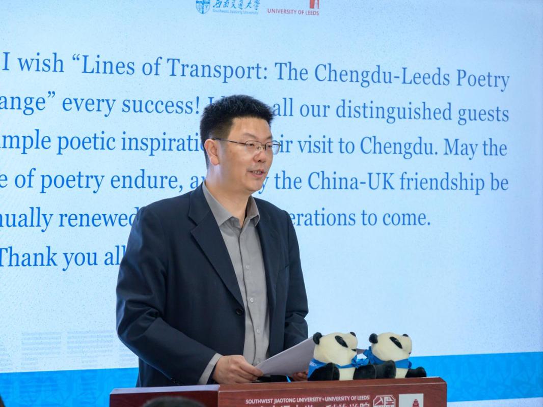 余海岁代表英国利兹大学对西南交通大学长期以来的支持表示感谢。他表示,西南交通大学-利兹学院是利兹大学最重要、持续时间最长的国际合作项目之一。利兹大学拥有悠久而深厚的诗歌传统,以此次诗歌盛会为契机,两校的合作正在不断拓展至文化与艺术领域。未来几天的诗会活动,将为大家提供一个难得而宝贵的平台,交流思想、分享感悟、探讨翻译,共同领略诗歌丰富多元的艺术形态,也期待本次诗会为与会嘉宾带来新的感悟与收获。