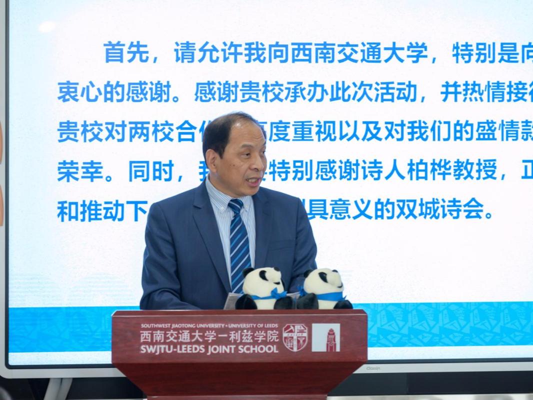 闫学东代表西南交通大学向英国利兹大学代表团,参加本次诗会的中外诗人、翻译家与各界专家学者表示欢迎。他表示,2014年两校携手共建西南交通大学-利兹学院,至今已成功培养6届1000余名优秀毕业生。这场以诗歌为纽带的人文交流,正是两校合作从工程科技、人才培养向人文艺术领域的自然延伸与创新拓展,必将为双方长期战略合作注入更深厚、更持久的文化动力。闫学东希望通过本次诗会,不仅能推动两校在文学翻译、比较文学、跨文化研究等领域的学术交流,更能持续深化西南交大与利兹大学的全面战略合作,为中英人文交流添砖加瓦,为构建人类命运共同体贡献温暖而坚定的文化力量。