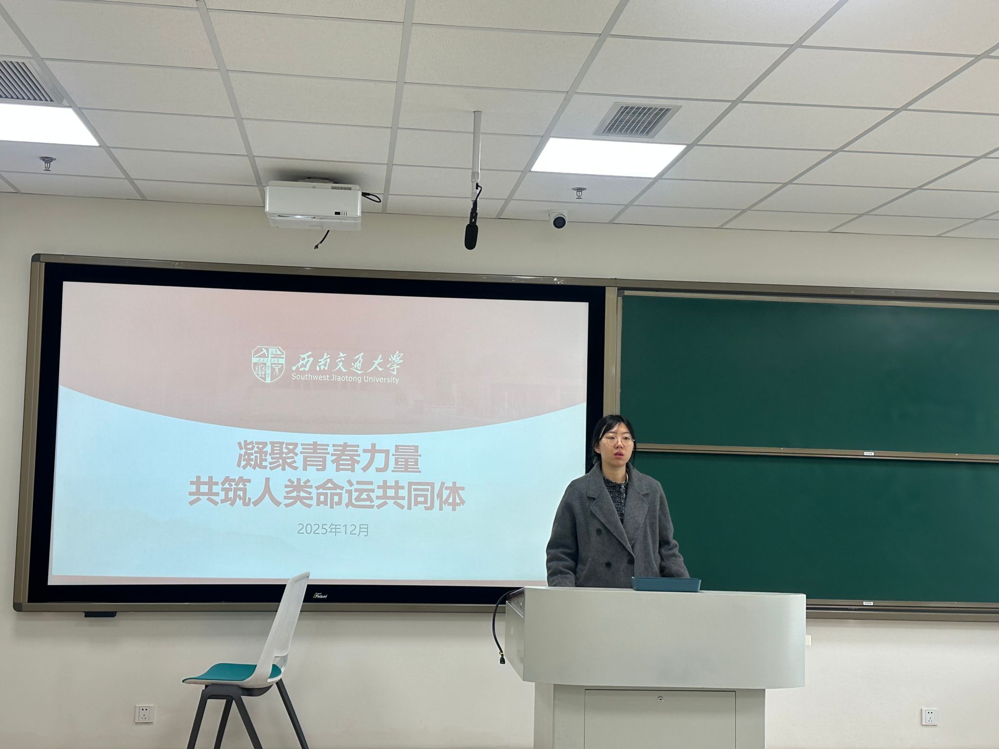2025年12月10日晚,青年讲师团成员刘妍在x30547教室为2025级青马工程培训班成员带来了一场主题为“凝聚青春力量 共筑人类命运共同体”的专题讲座。本次讲座以本院在联合国组织中崭露头角的优秀学子周夏冰、王冰旭为例切入,展现了新时代青年参与全球治理的积极姿态,引导同学们思考个人成长与时代使命的连接。