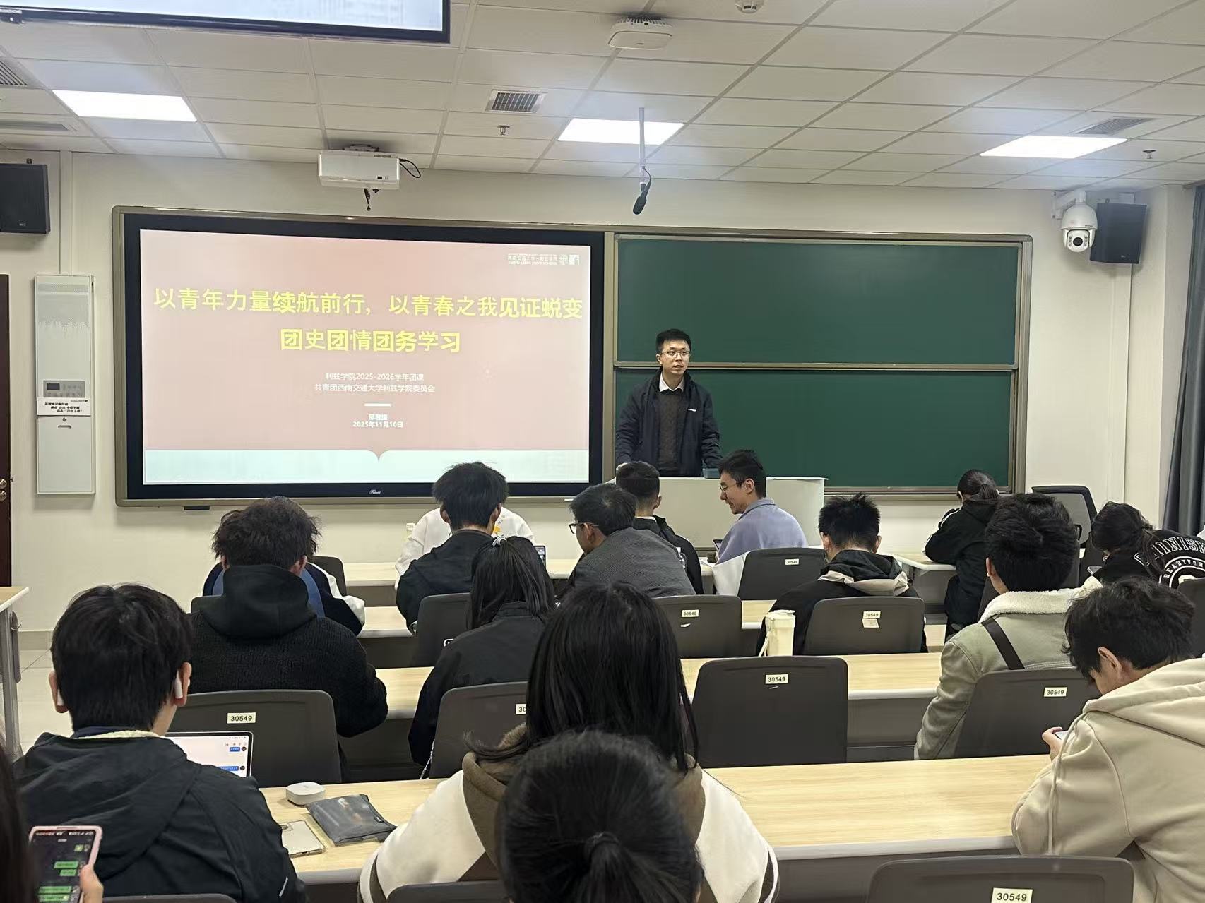 2025年11月10日,青年讲师团成员邱君捷面向全校团员青年,开展了一场以“以青年力量续航前,以青春之我见证跨越”为主题的团史团情团务学习讲座。讲座围绕共青团的光辉历程、新时代青年使命与团员责任担当展开,激励团员青年传承红色基因,凝聚奋进力量。